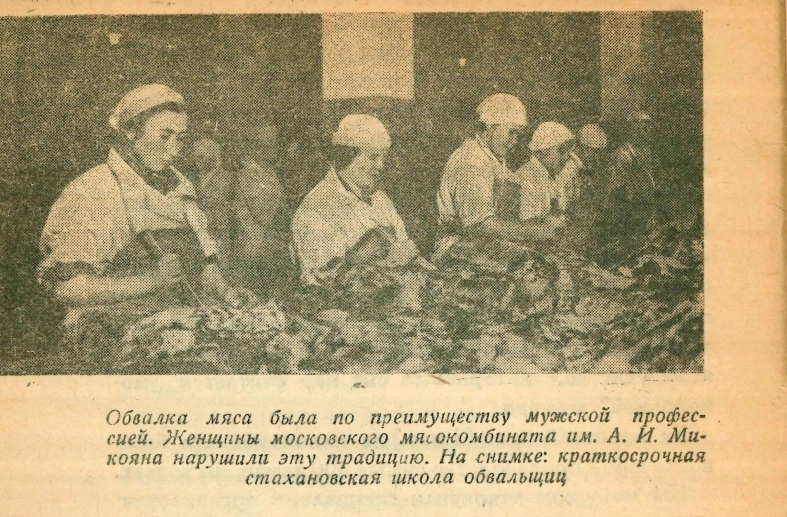 Судя по гламурному тону, читатели вероятно уже поняли — речь о 1930-х годах. Именно тогда, освободив женщину от кухонного рабства, большевики призвали ее на производство. Это ж не сравнить с тем, как на примусе макароны варить. «Окончив стахановскую школу, я стала на самостоятельную работу — обвалку грудинок, — с гордостью рассказывает обвальщица Клавдия Кукушкина. — Выполняю я норму на 120%, обрабатывая 600 половинок туши весом 100−150 кг».