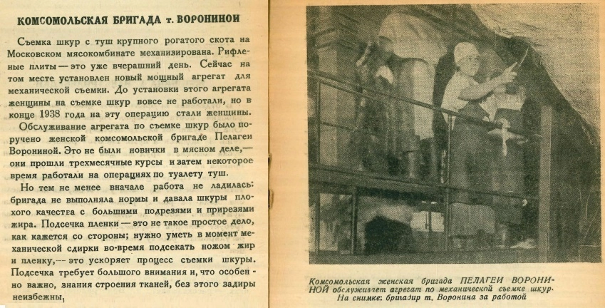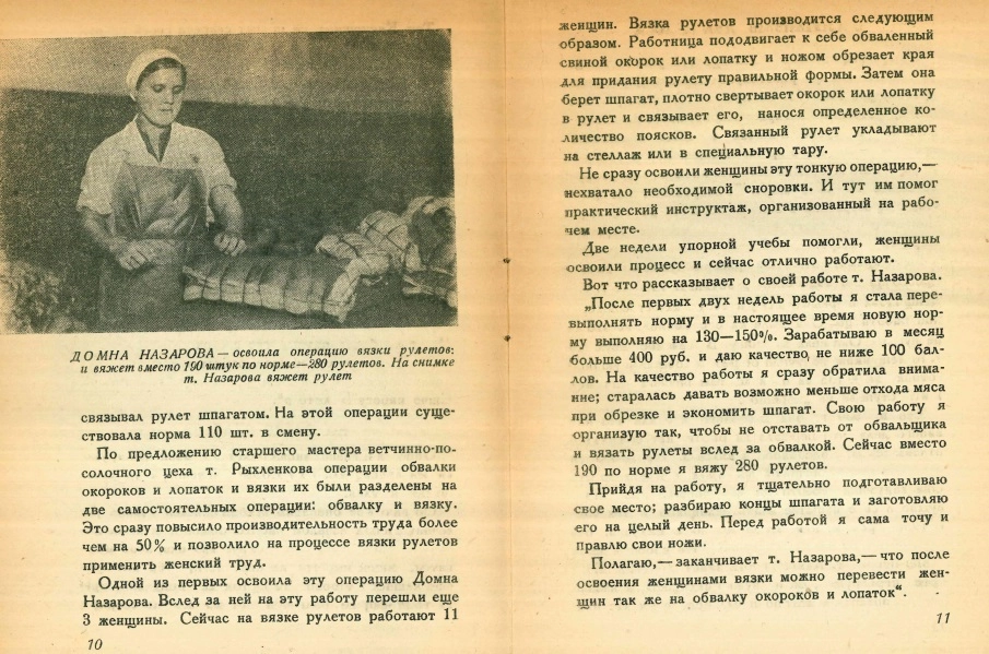 «Освоение норм по обвалке грудинок мне сразу не удавалось. В первый месяц я выполняла норму на 80%". — Сейчас она — знатный человек Московского мясокомбината, отличница мясной и молочной промышленности.