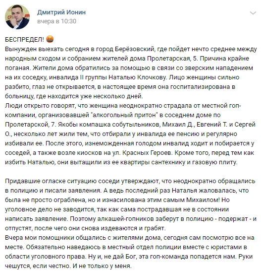 Люди открыто говорят, что женщина неоднократно страдала от местной гоп-компании, организовавшей „алкогольный притон“ в соседнем доме по Пролетарской, 7. Якобы компашка собутыльников, Михаил Д., Евгений Т. и Сергей О., несколько лет жили тем, что отбирали у инвалида ее пенсию и регулярно избивали ее, — написал депутат.