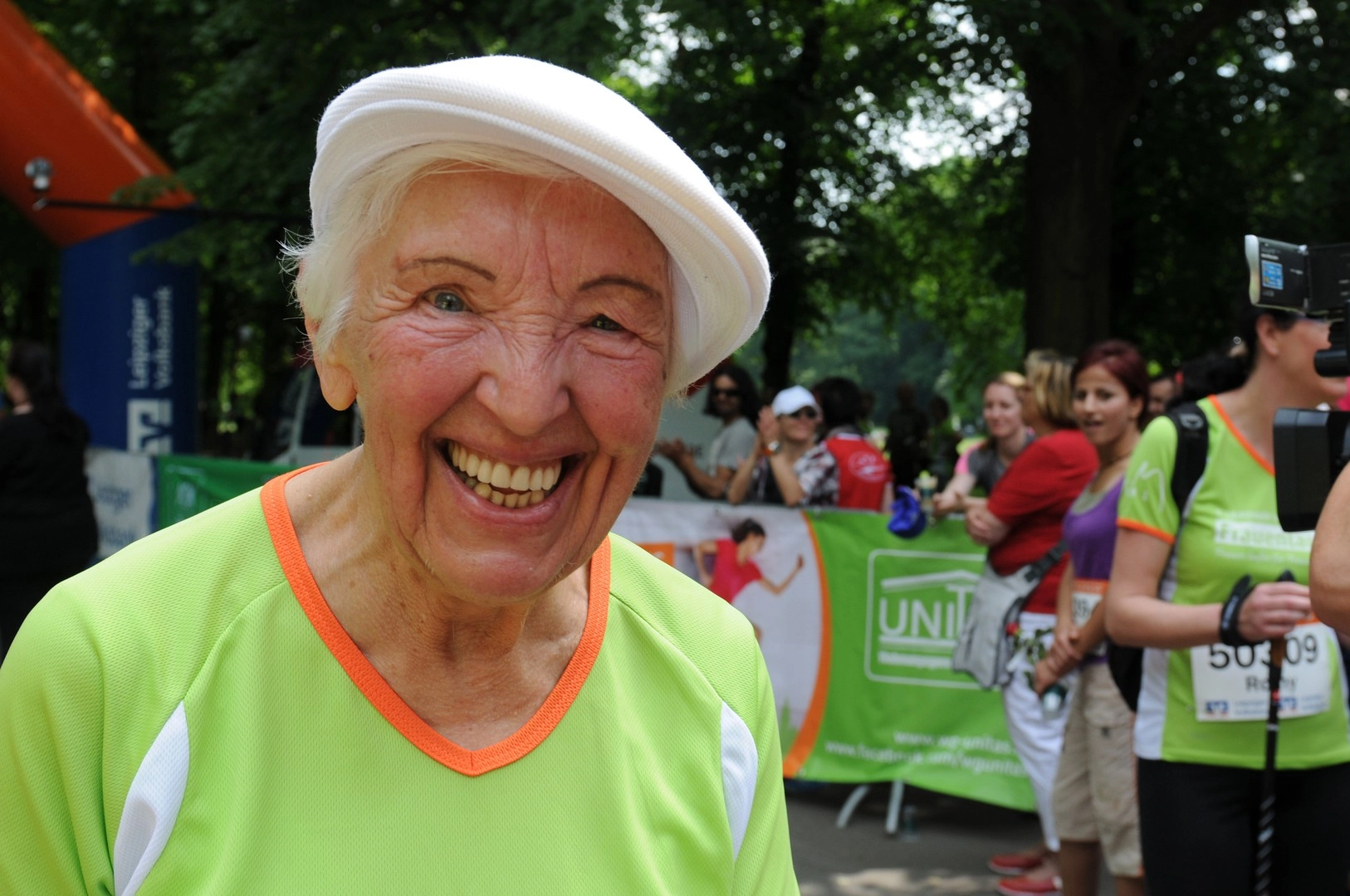 Еще одна участница — 83-летняя Марга Швотцер (Marga Schwotzer) уже в 7 раз принимала участие в женском забеге. Она преодолела дистанцию 5 км скандинавской ходьбы и на финише была бодра и весела.