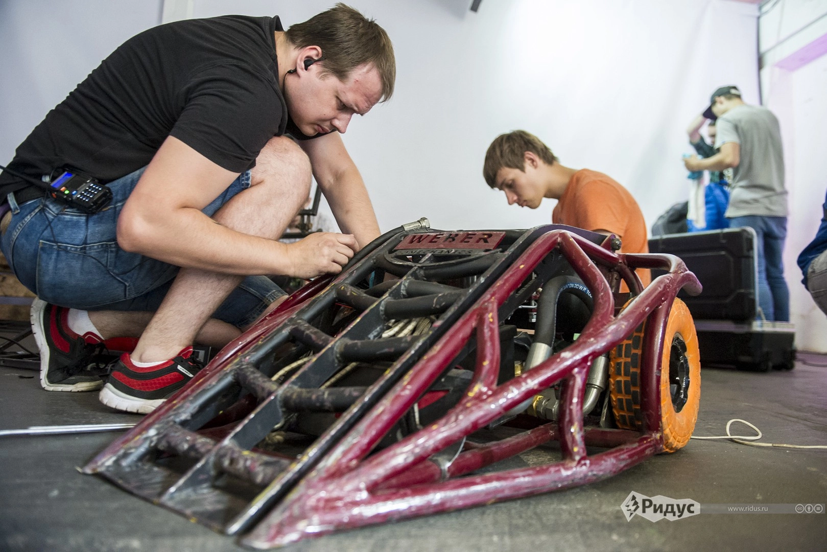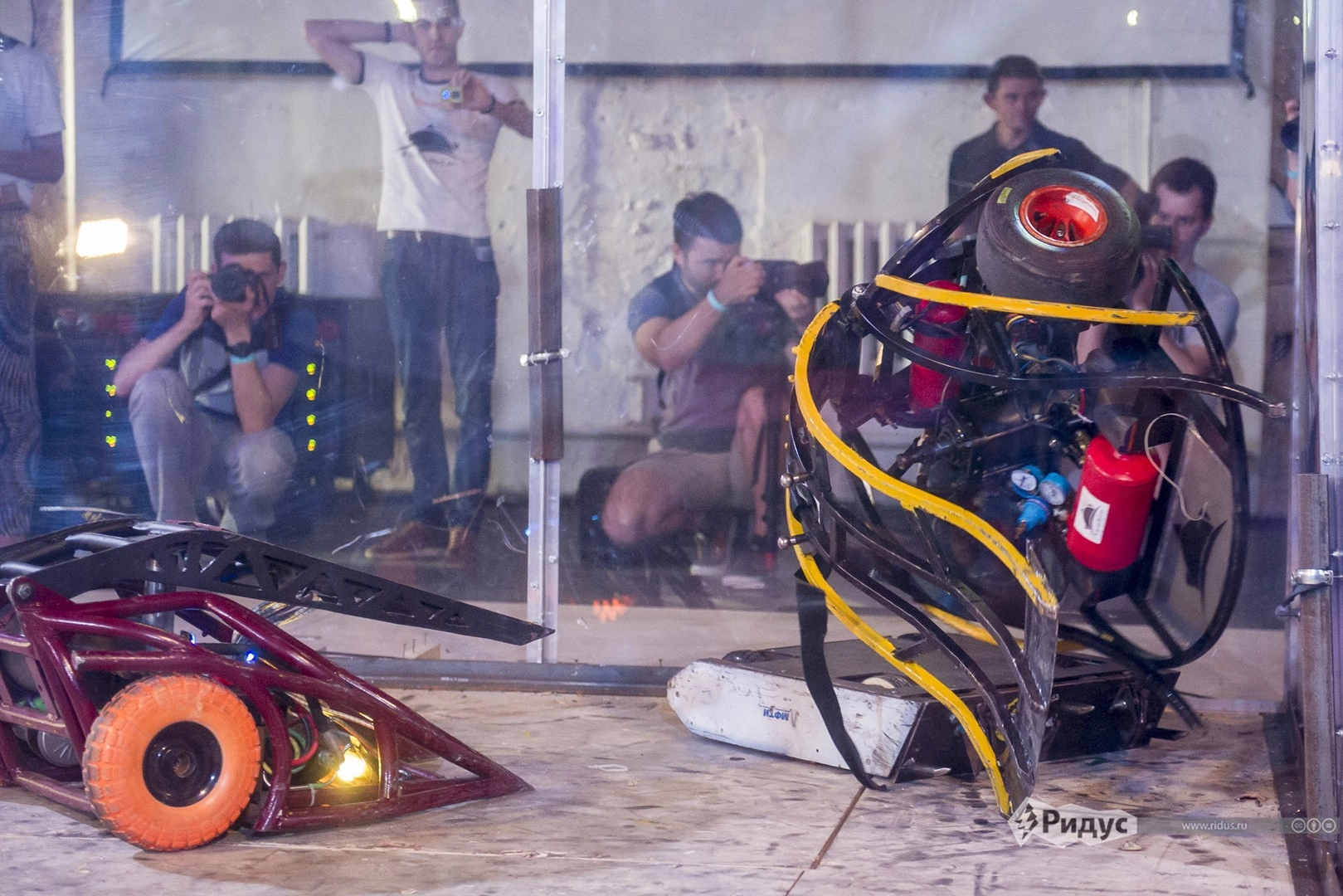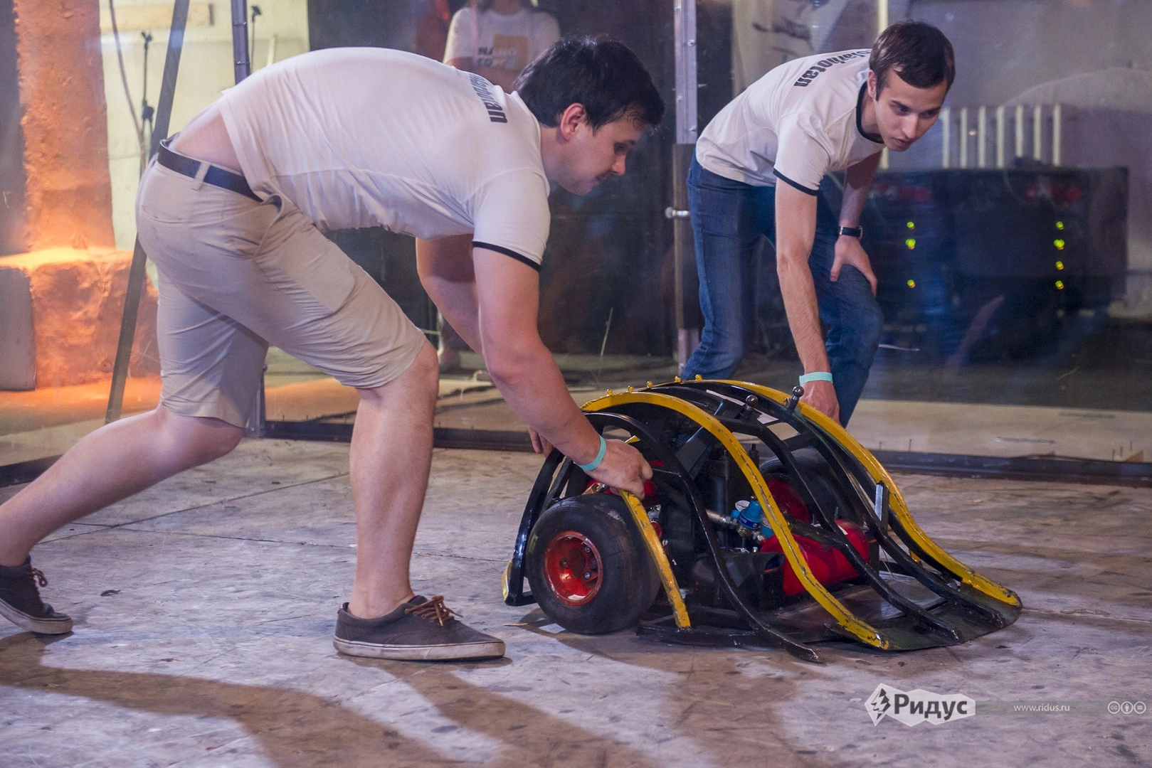 «Мы — первопроходцы в России, кто собирает боевых роботов, которые могут сражаться на ринге и разрушать других таких же роботов. Первую битву я увидел со своей девушкой, мы пошли на ВДНХ, там проводили „Бронебот.“ Качество российских роботов было, мягко говоря, не очень, и вместо того, чтобы критиковать, мы собрали команду и сделали своих роботов. Это наша вторая модель, мы называем его Шелби. Мы посмотрели очень много роботов английских коллег. Самый просто робот — это флиппер, он открывает крышку и переворачивает противника. Удар порядка двух тонн. А если кто-то прервернёт нас, то мы можем встать со спины», — рассказывают робототехники из команды Solarbot.