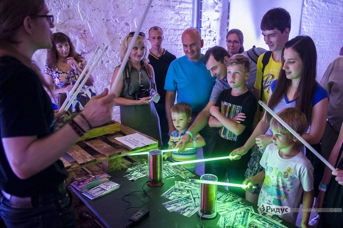 «Смысл нашей программы и вообще Тесла-Шоу — это эксперименты Теслы, его изобретения, его исследования, делаем всё по его чертежам, делаем катушки, делаем вот такие колбы, которые вы сейчас увидите, и рассказываем людям на самом простом языке про элементарные понятия в физике», — рассказал ведущий «Teslashow» Андрей Приволихин.
