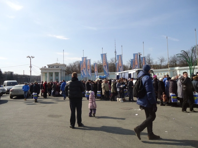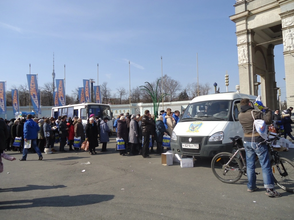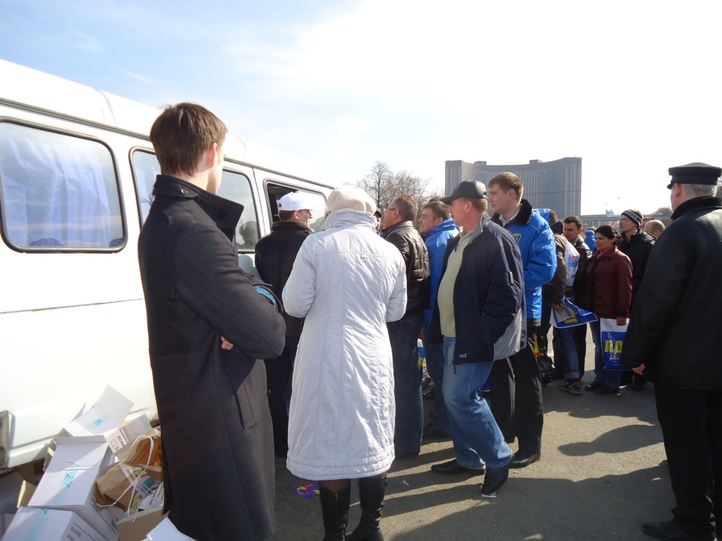 На площади напротив огромных ворот, в которые и из которых двигались тысячи людей, припарковался микроавтобус с ярким логотипом ЛДПР. Видимо, там прошёл и небольшой митинг, однако после него ажиотаж вокруг либерал-демократов не упал, а, наоборот, только усилился. Дело в том, что из всё-того же транспортного средства началась раздача пакетов с агитационными материалами, а также... водки.