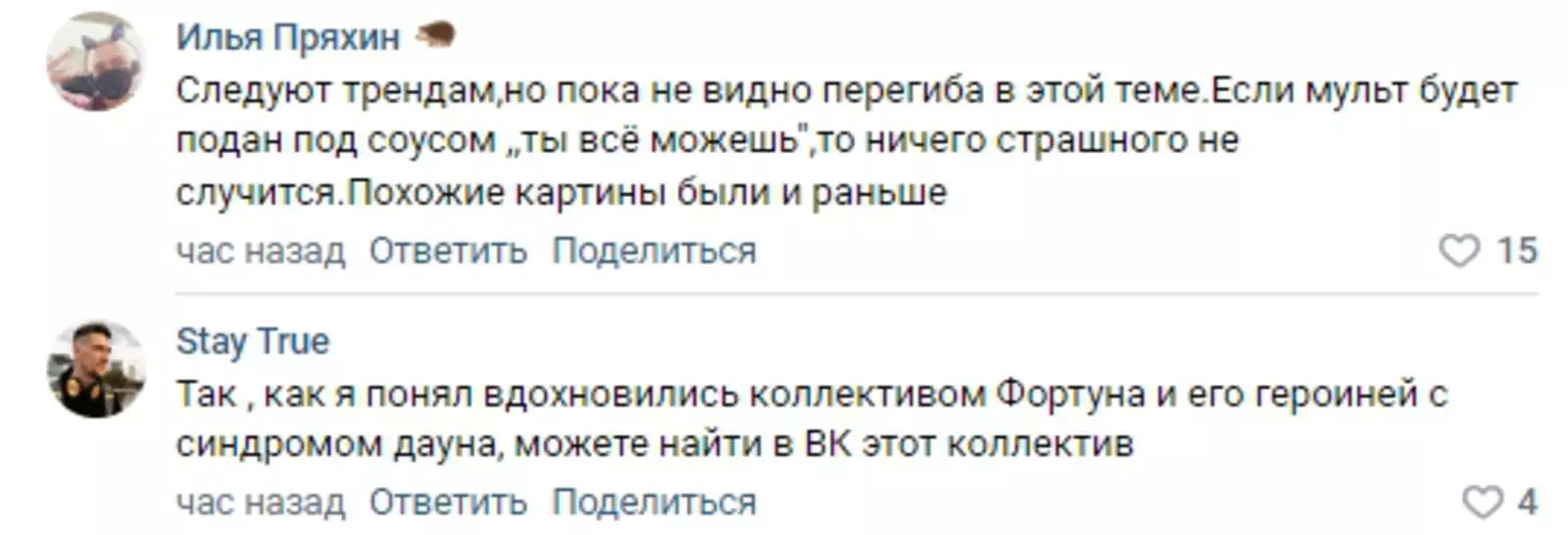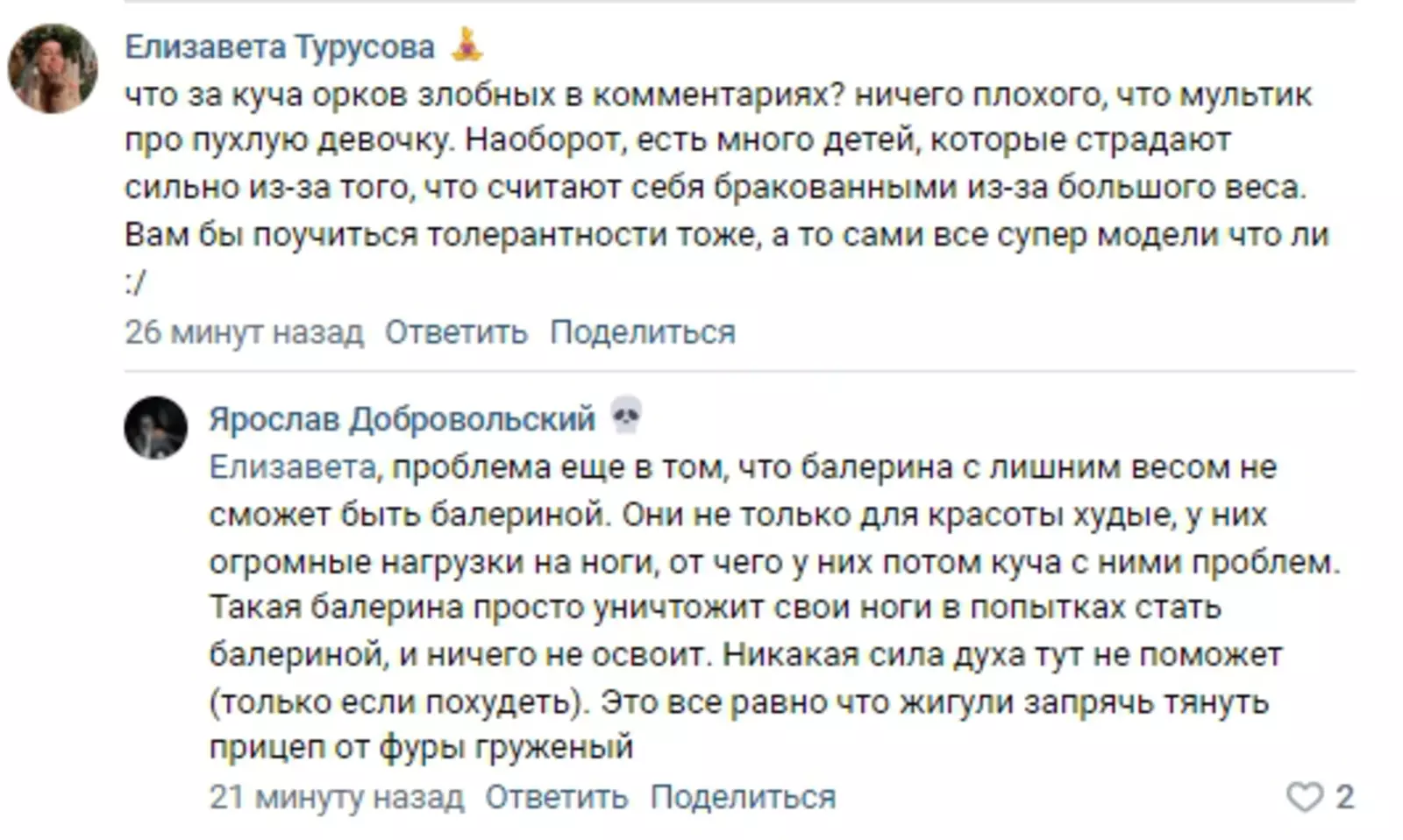 В то же время у пухленькой начинающей мультипликационной балерины от Disney нашлись и заступники, которые призывали не втаптывать мультфильм в грязь почём зря и забыть про стереотипы о людях с лишним весом: «Что за куча орков злобных в комментариях»?
