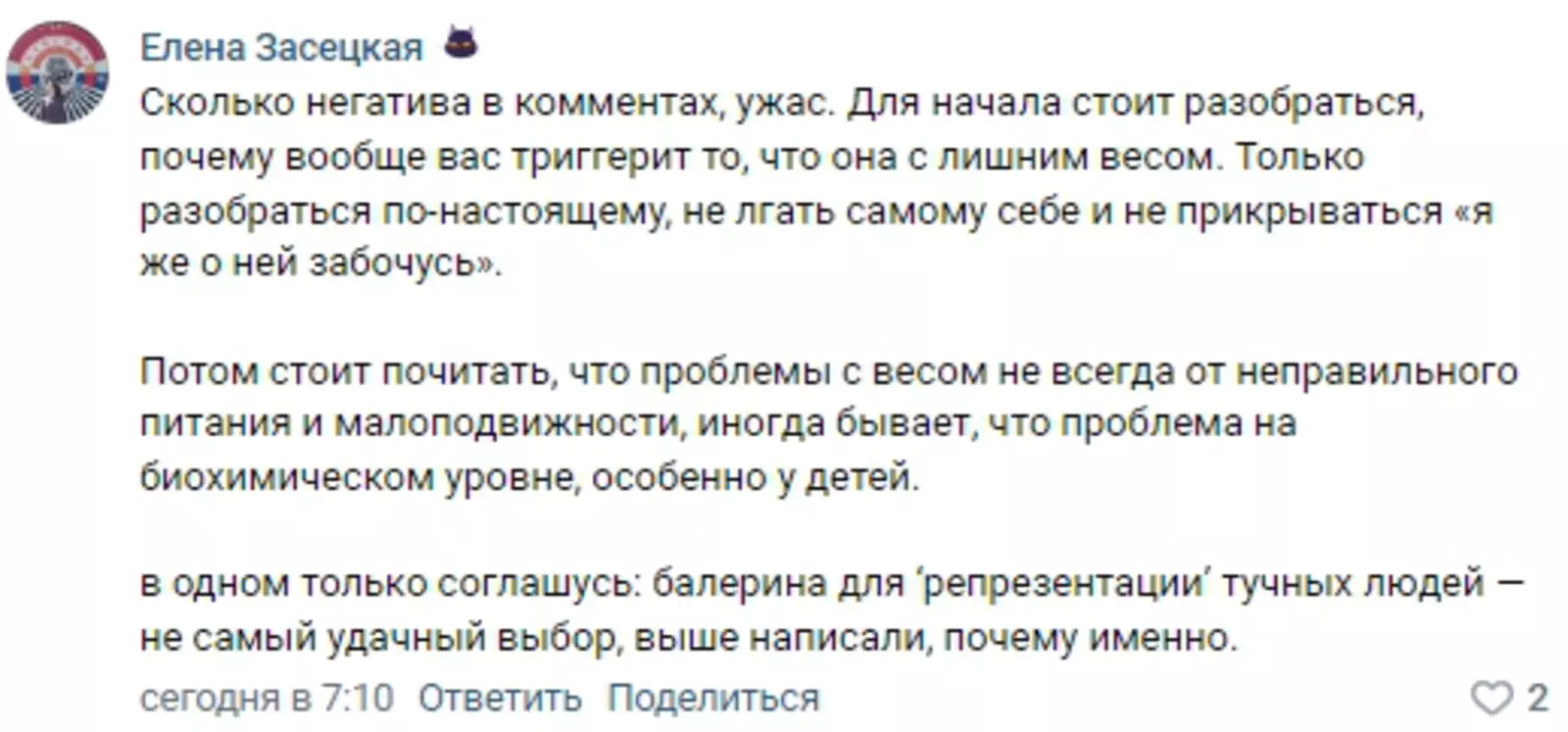 «Для начала стоит разобраться, почему вообще вас триггерит, что она с лишним весом», — заявили защитники «Отражения».