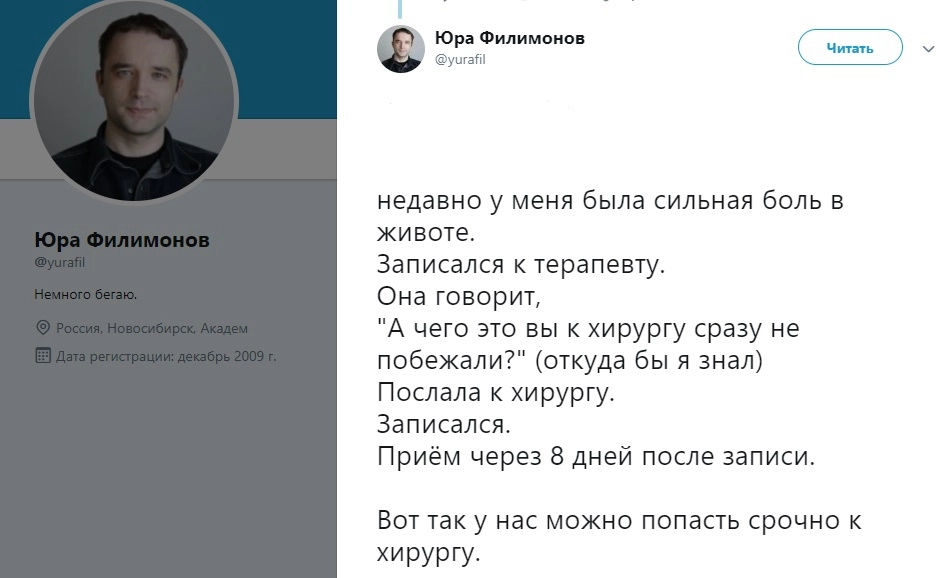 В середине февраля 37-летний Юрий Филимонов в своем микроблоге в Twitter пожаловался на сильную боль в животе.