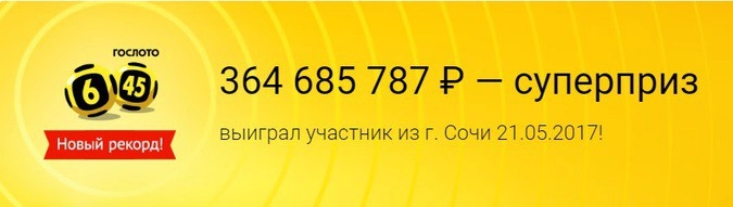 21 мая в «Гослото „6 из 45“» был разыгран рекордный суперприз в размере 364 685 787 рублей. Невероятную сумму выиграл житель города Сочи, сообщается на лотерейном сайте stoloto.ru.