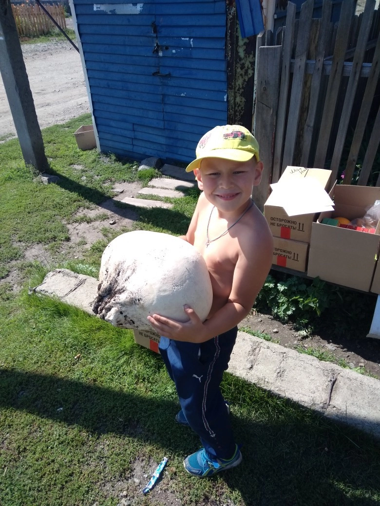 Малев нашел грибы на картофельном поле. Один из них весил 1,5 килограмма. Но главный «приз» — шестикилограммового гиганта — с трудом поднимал сын Алексея Никита.