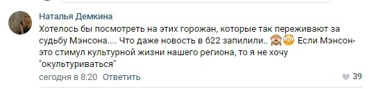Впрочем, петиция, созданная 4 июля, не пользуется общественным вниманием в Рунете: ее подписали всего 105 человек. Судя по обсуждениям в соцсетях, жители края тоже не в восторге от потенциального нового соседа. Кто-то считает, что Мэнсону Алтай покажется неказистым даже по сравнению с американской тюрьмой, кому-то просто претит его творческий метод.