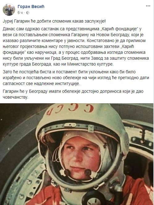 «Сегодня я провел встречу с представителями фонда „Братья Карич“ в связи с установкой памятника Гагарину в Новом Белграде, который вызвал разные комментарии общественности. Мы констатировали, что в ходе его проектирования не выполнены требования фонда как заказчика, а в процесс утверждения внешнего вида не были включены ни город Белград, ни управление по защите памятников культуры, ни Министерство культуры», — написал сити-менеджер Белграда Горан Весич в Facebоok.