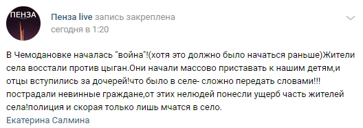 Ранее в соцсети «ВКонтакте» появилось сообщение о том, что между жителями села и представителями цыганской общины произошла массовая драка. Сельчане назвали виновниками конфликта цыган, которые якобы приставали к дочерям местных жителей.