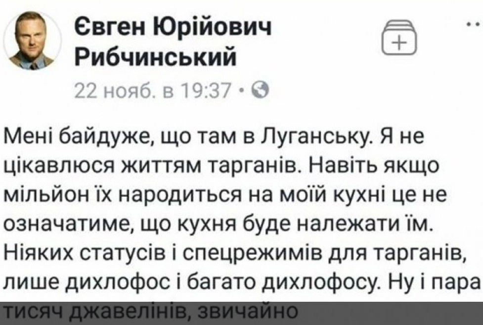Депутат Верховной рады Украины Евгений Рыбчинский назвал жителей Донбасса тараканами, заслуживающими не особого статуса, а только «много дихлофоса». Об этом он написал в личном микроблоге, комментируя смену власти в ЛНР.