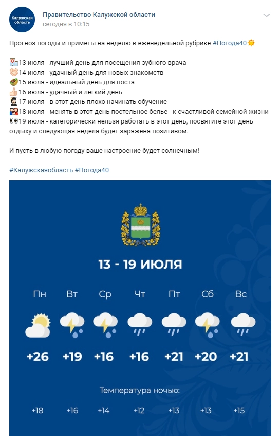 На официальной страницае правительства Калужской области в социальных сетях появились публикации с прогнозом погоды и житейскими «приметами на неделю» с хэштегом #погода40. В них жители региона могут ознакомиться с ценной информацией — в какой день недели лучше идти к зубному врачу, в какой начинать уборку, в какой заводить новые знакомства и так далее.