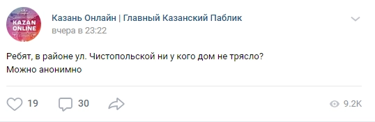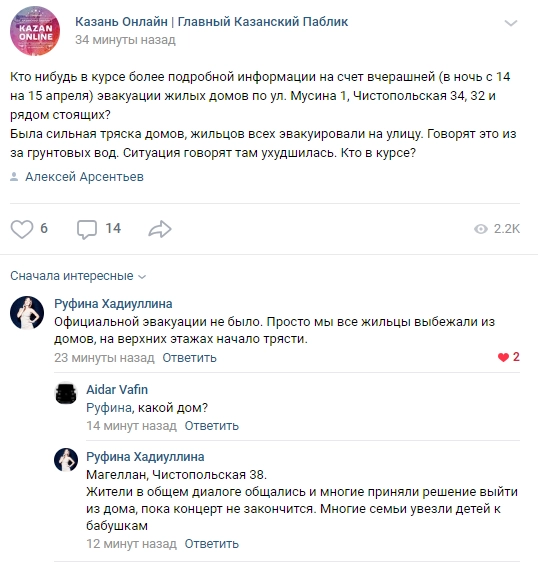 МЧС приезжали, потом поехали в „Татнефть Арену“, потом вернулись обратно. Скорая мужу звонили, мы отказались (потому что без надобности), пожарная не приезжала (потому что пожара нет), МЧС дом осмотрели, и все! Говорят, не качается ничего, а то, что толпа людей с детьми, документами стоят на улице в 23.00? — вопрошает местная жительница.
