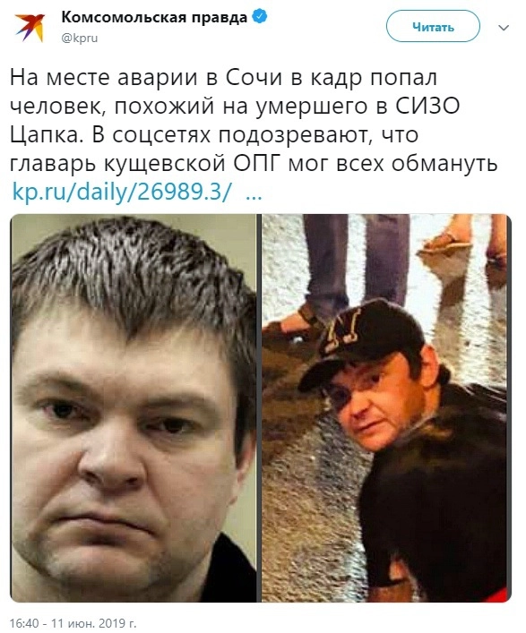 Жители Краснодарского края обратились к прокурору с просьбой проверить информацию о том, что на фотографии, сделанной на месте ДТП в Сочи 4 июня, запечатлен человек, похожий на лидера кущевской ОПГ Сергея Цапка. Об этом сообщает kp.ru со ссылкой на документ.