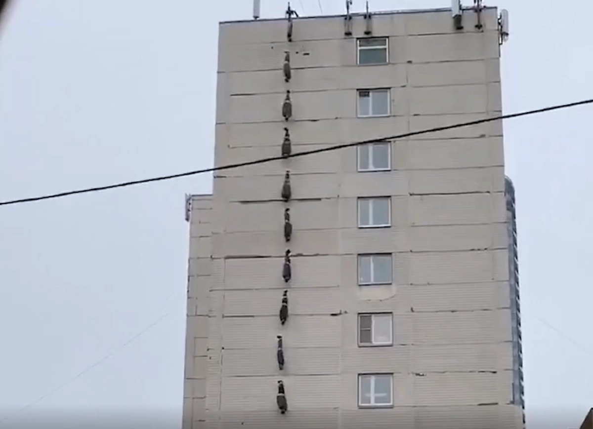 На кадрах видно, как связанные веревкой пакеты, напоминающие связку трупов, кто-то поднимает вверх. Действие разворачивается на фоне церкви. Недалеко от МОНИКИ припаркована погрузочная машина, где также лежат трупные пакеты, но в какой-то момент они начинают шевелиться, и оттуда вылезают вполне живые и здоровые люди.