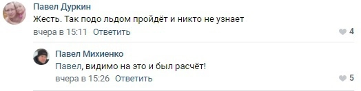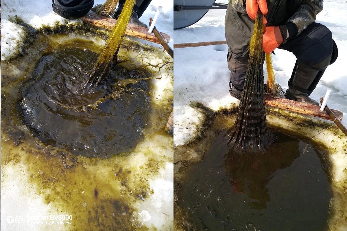 18 апреля в сообществе «Слухи / Нарьян-Мар» появились снимки проруби с чудовищно загрязненной водой зелено-коричневого цвета. Публикатор фото утверждал, что сделал его в районе деревни Осколково неподалеку от Нарьян-Мара.