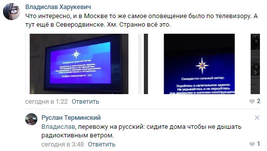 Многие пользователи социальных сетей восприняли сообщения о повышенном радиационном фоне более чем серьезно. Нашлись и такие, кто связал со взрывом в Неноксе даже сильный ветер вечером 8 августа в Москве.