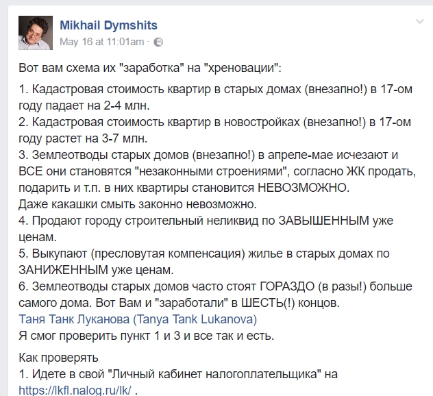 «В этих играх с кадастровой стоимостью и с землеотводами само по себе ничего нового не изобретено. Я знаю, что именно такие трюки с ценовыми ножницами между жильем сносимым и жильем, предоставляемым взамен, проводились еще году в 2013-м. Просто тогда это были точечные сносы, они затрагивали интересы жильцов отдельных домов, и такие фокусы не вызвали скандалов. Сейчас же, когда затронуты интересы полутора миллионов человек, втихаря проворачивать эту схему уже не получается. Потому что среди этих полутора миллионов есть вполне грамотные люди, которые в состоянии провести профессиональное расследование этих схем», — говорит Кушаков, сам юрист по образованию.