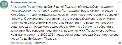 Тем не менее у администрации Тюменского района есть план выхода из ситуации. Пресс-служба районного руководства утверждает, что корень проблемы — сами подземные источники в районе Яра, где в воде содержится избыток железа. Самый простой вариант, как считают в администрации, — запитаться водой от водозабора Тюмени.