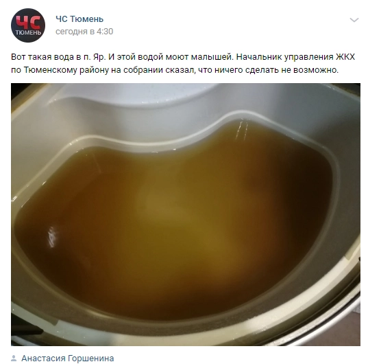 Жители села Яр Тюменской области, расположенного по соседству с региональным центром, пожаловались на ржавую воду, которая течет из водопроводных кранов с 70-х годов прошлого века. Об этом рассказала жительница села Анастасия Горшенина в областном сообществе «ЧС Тюмень».
