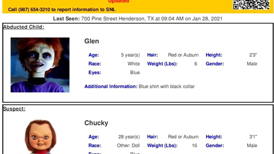 Это было бы довольно пугающее сообщение, если бы не тот факт, что убийца — это кукла Чаки, плод воображения создателей фильмов «Детские игры», а похищенный ребенок — его сын Глен, который родился в одной из нескольких частей кинофраншизы.