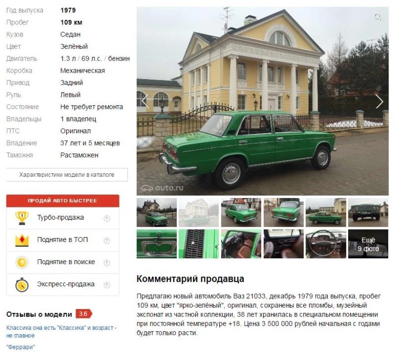На Auto.ru появилось объявление о продаже ВАЗ-2103 1979 года выпуска. Владелица оценила автомобиль зеленого цвета в 3,5 миллиона рублей. И это лишь стартовая цена. Из объявления следует, что стоимость автомобиля с каждым годом будет только расти. Немалую сумму обладатели отечественного авто просят за «музейный экспонат из частной коллекции».