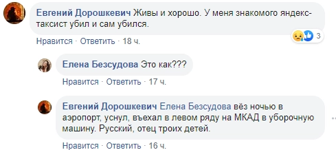 У Безсудовой возникло было подозрение, что ее водитель выпил или принял наркотики. Но комментаторы в Facebook, сталкивавшиеся с подобными ситуациями, считают, что шоферы, работающие с «Яндекс.Такси», Uber и другими агрегаторами, в основном от переработки — бывает, что человек провел за рулем 12−16 часов. А явление это нередкое.