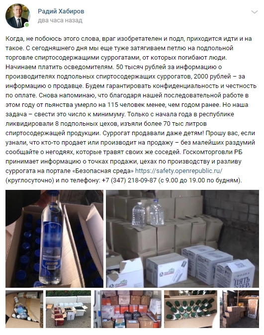 С сегодняшнего дня мы еще туже затягиваем петлю на подпольной торговле спиртосодержащими суррогатами, от которых погибают люди. Начинаем платить осведомителям. 50 тысяч рублей за информацию о производителях подпольных спиртосодержащих суррогатов, 2000 рублей — за информацию о продавце. Будем гарантировать конфиденциальность и честность по оплате, — написал Хабиров на своей странице в соцсети «ВКонтакте».