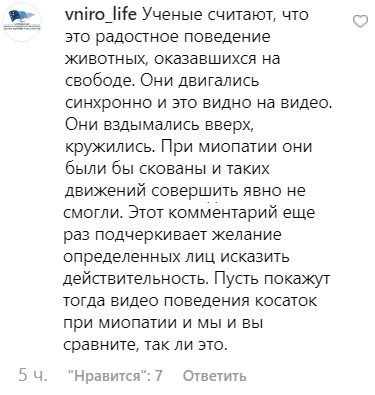 Эти кадры, снятые с воздуха, были опубликованы в Instagram. В ролике запечатлено, как морские животные активно ныряют и всплывают. Как передает РИА Новости, экологи уверены: такое поведение косаток говорит о том, что они испытывают стресс. Пресс-секретарь НИИ рыбного хозяйства и океанографии Алексей Смородов не согласился с этими выводами — по его мнению, таким образом косатки выражают ликование. Он отметил, что они двигались синхронно, а при миопатии таких действий совершить бы не смогли.
