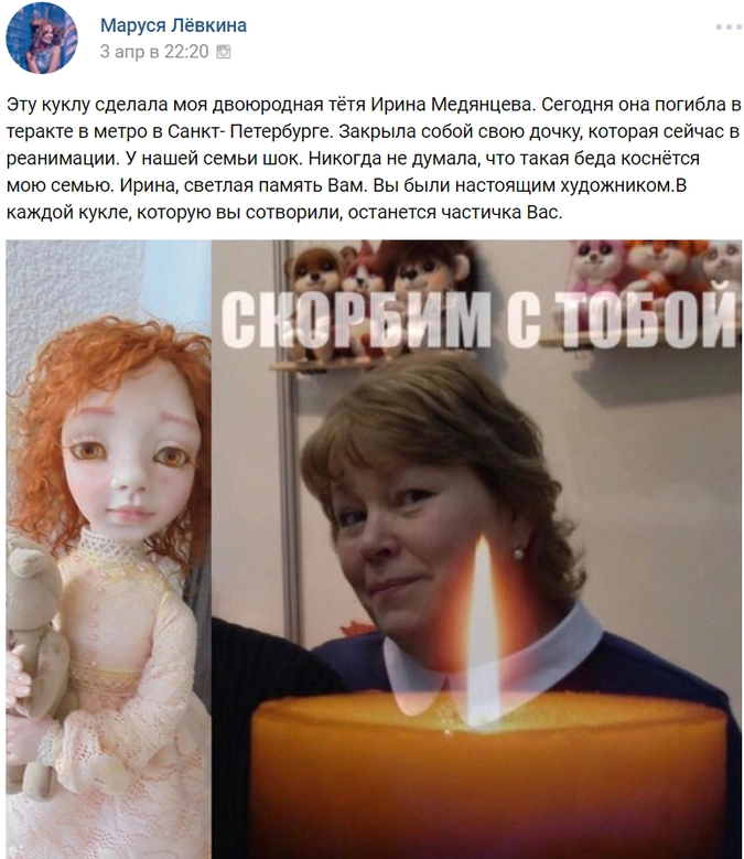 В тот роковой день, 3 апреля, Ирина Медянцева с дочерью Алёной ехала с куклами в метро. В момент взрыва мать закрыла дочку своим телом. Ирина от полученных травм умерла по пути в больницу. 29-летняя Алёна сейчас находится в реанимации в стабильно тяжёлом состоянии.