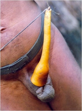(Для тех, кому лень посмотреть: Котека — это традиционная одежда в некоторых высокогорных племенах Новой Гвинеи. Котеки носят без другой одежды, подвешенными в направленном вверх положении. В практическом применении котека защищает пенис от опасных сильных порезов длинными острыми листьями растений при движении в джунглях).