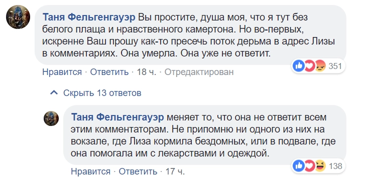 «А все ли помнят, с чего начинала Елизавета Глинка и в какое услужливое, потасканное ничтожество она позволила себя превратить незадолго до смерти? Все помнят, как кремлевские сволочи ее хладнокровно и сноровисто употребили в дело на раннем этапе войны в Донбассе? Все помнят эти гнусные фотографии „доктора Лизы“ на фоне улыбок Марины Юденич и мадам Симоньян?», — написал Пархоменко на своей странице в Facebook.