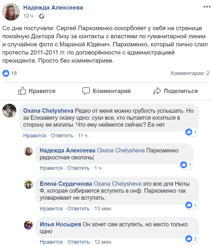Журналист Надежда Алексеева в свою очередь заявила, что Сергей Пархоменко ранее и сам был замечен в сотрудничестве с властью. Со слов Алексеевой, он «лично слил протесты 2011 года по договоренности с администрацией президента».