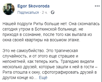 Как сообщил в Facebook ее коллега Егор Сковорода, она отошла к окну сфотографировать друзей, находившихся в другом конце комнаты. «Окно было открыто, она села на подоконник и, откинувшись с телефоном, неудачно облокотилась об антикошачью (антимоскитную) сетку, потеряла равновесие и выпала из окна», — написал он.