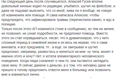 «Из его рассказов я знала, что он поднимает руку на своих пассий. Однажды он пожаловался, что его девушка после ссоры с ним попала в больницу в тяжелом состоянии. У меня нет доказательств, это были слова самого АП (Алексея Павловича. — Прим. „Ридуса“). Еще одна девушка, бывшая сотрудница „МК“, оперировала нос, который ей сломал Алексей, когда они встречались…»