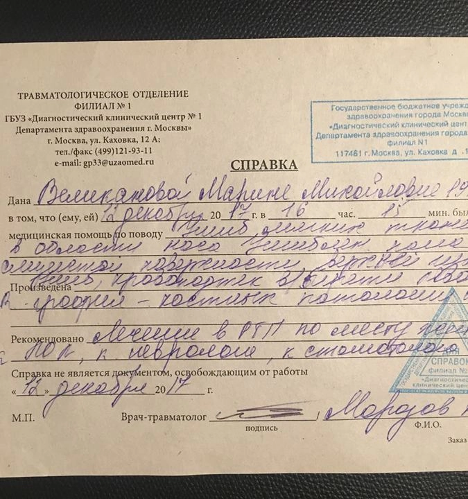 В подтверждение журналистка опубликовала фотографии справок о побоях.