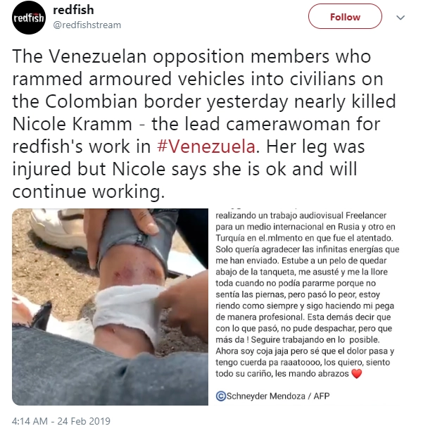 Представители венесуэльской оппозиции, которые вчера наехали на мирных жителей на бронированных автомобилях, чуть не убили Николь Крамм — ведущего оператора Redfish в Венесуэле. Николь ранили в ногу, но она сказала, что в порядке и продолжит работать, — сообщается на странице проекта Redfish в Twitter.