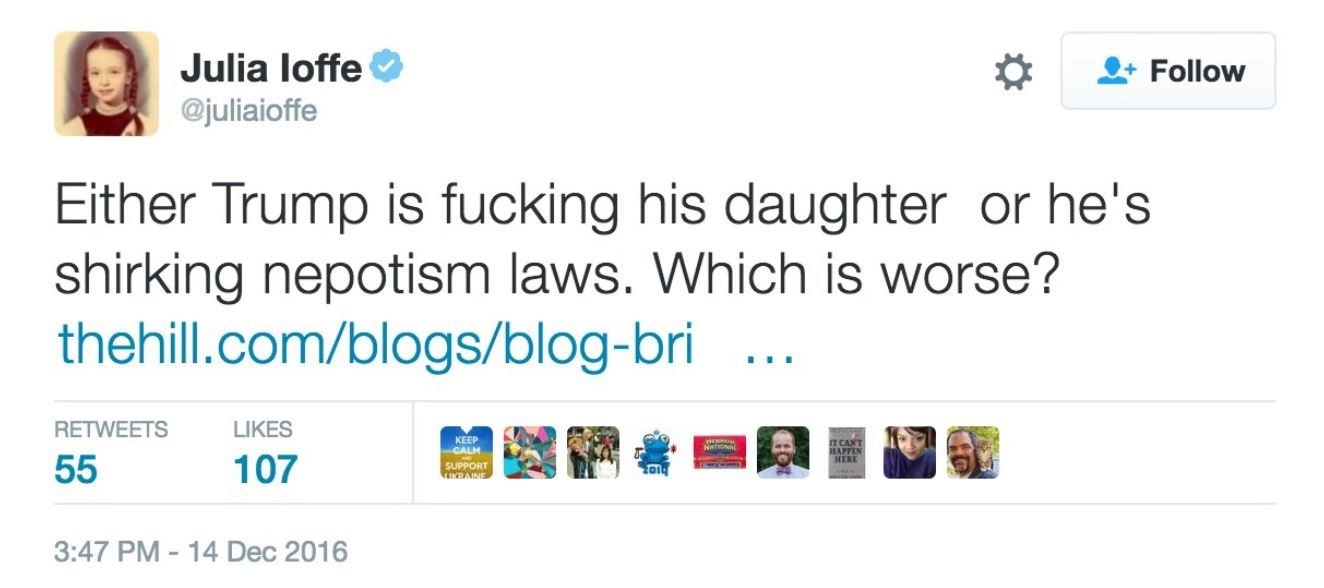 «Или Трамп трахает свою дочь, или игнорирует законы о борьбе с непотизмом [речь идет о привилегиях для родственников. — Прим. «Ридус]. Что из этого хуже?» — спросила Иоффе, реагируя на сообщения СМИ о том, что личный кабинет Иванки Трамп в Белом доме решили разместить в помещениях, которые раньше занимала первая леди. Иванка многие годы работает в команде своего отца, во время выборов была одним из руководителей его президентской кампании и собирается помогать Трампу во время его работы на посту главы США.