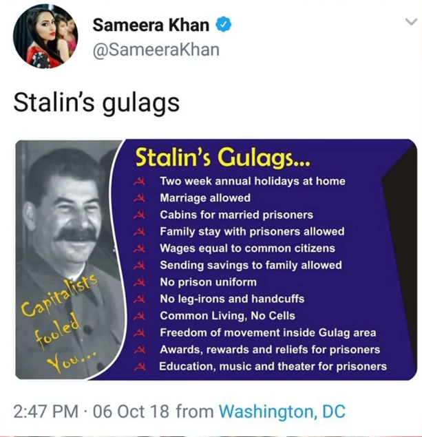 Журналист издания Russia Today Самира Хан (Sameera Khan) опубликовала на своей странице в Twitter несколько мемов о ГУЛАГе. Она иронично описала «преимущества» жизни в лагерях.