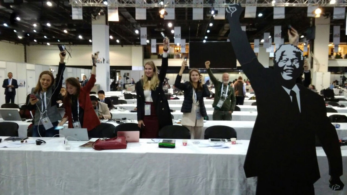 «На саммите БРИКС проблемы с работой беспроводных переводчиков. Чтобы поймать сигнал, надо стоять с вытянутой рукой. По иронии судьбы пресс-центр заранее украсили похожей картонной фигурой Манделы», — поделились журналисты, подтвердив свои слова фотографией с места событий.