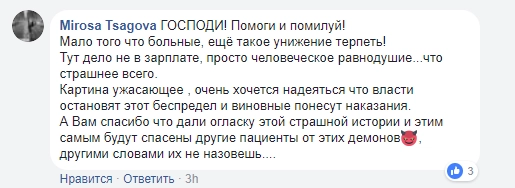«Да и памперсов, как оказалось, не хватает — лежат в мокрых, плачут, но медперсонал равнодушен… Как можно идти МИМО пациента с голой задницей, лежащего на холодном полу?» — отметила журналистка.