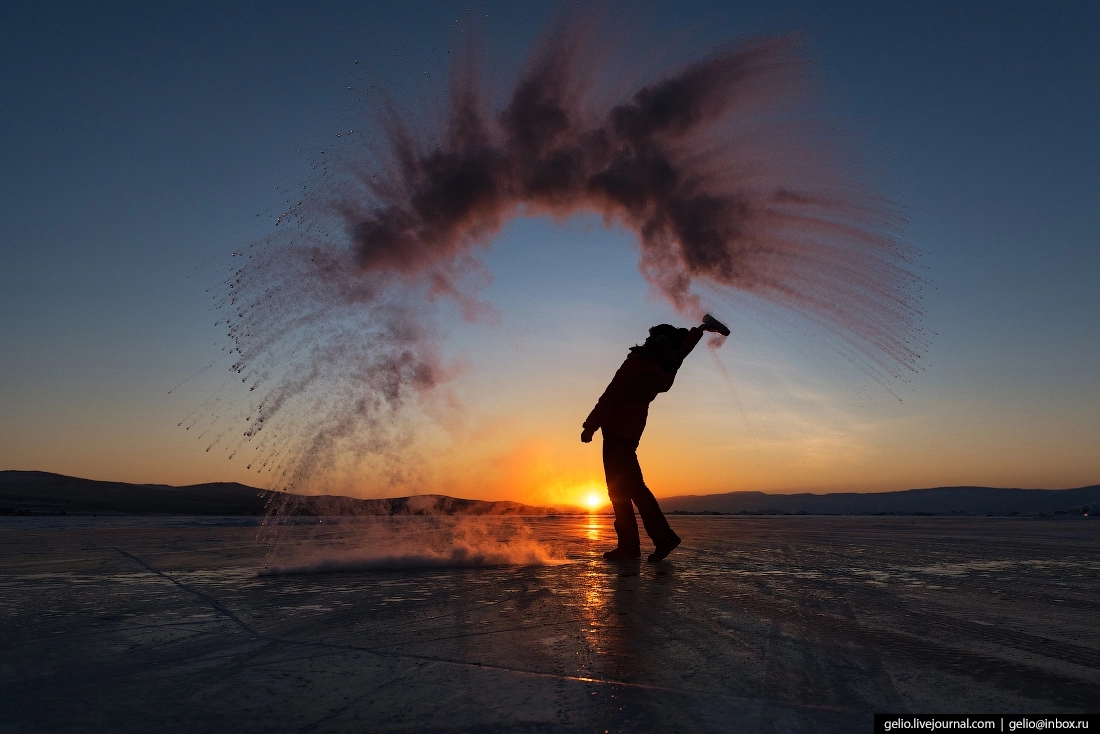 Покрытый льдом Байкал называют самым большим катком в мире. Зимой это огромное озеро, по площади сравнимое с Бельгией, замерзает целиком — кроме того небольшого участка, где из него вытекает река Ангара.