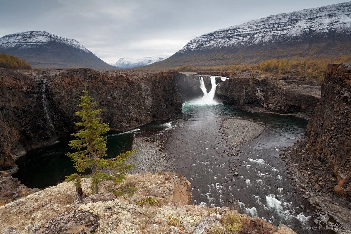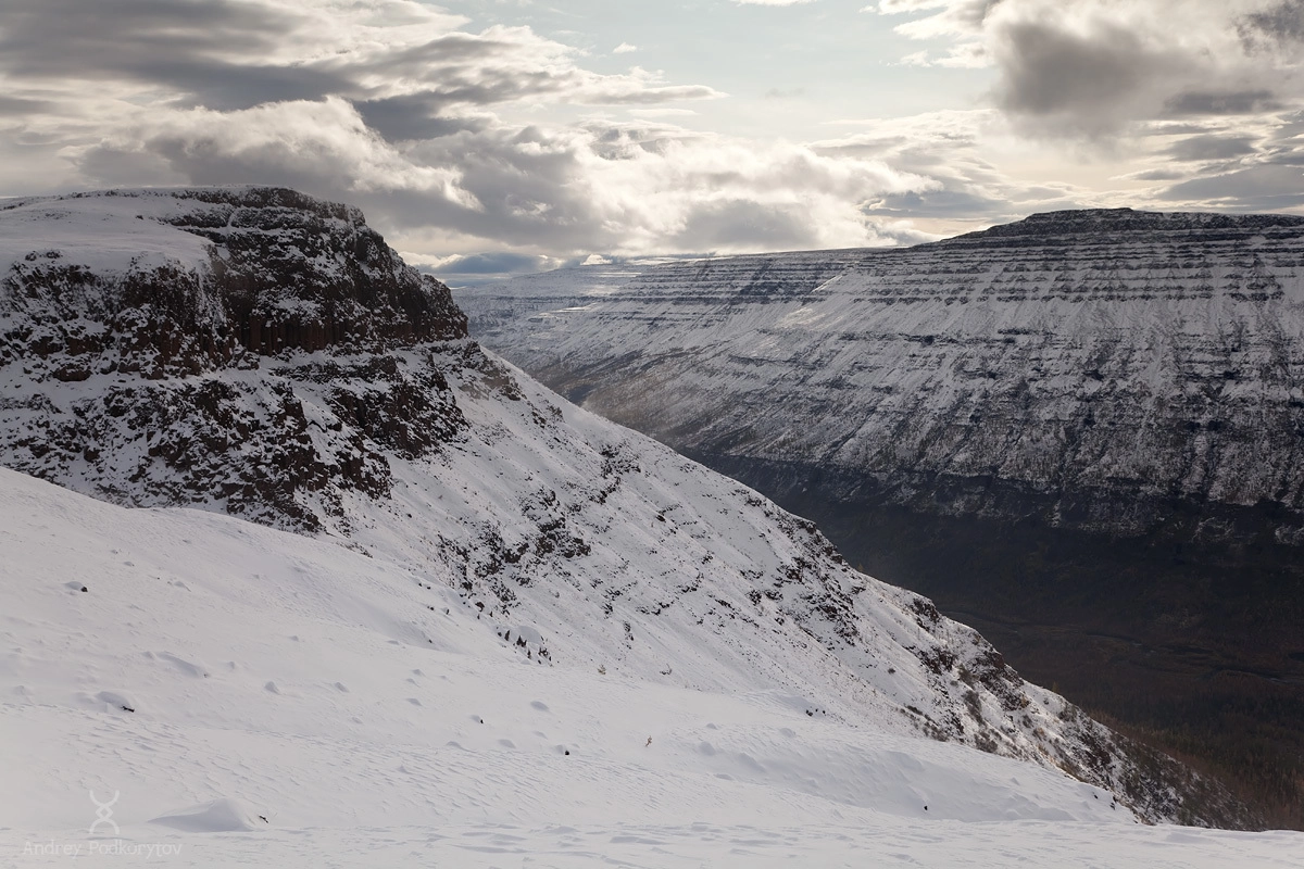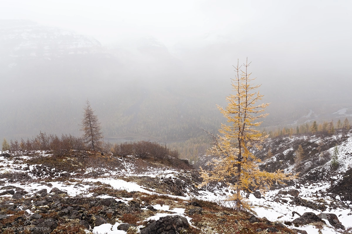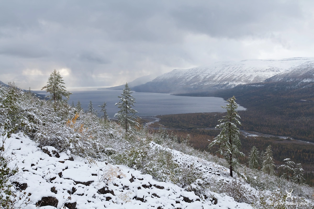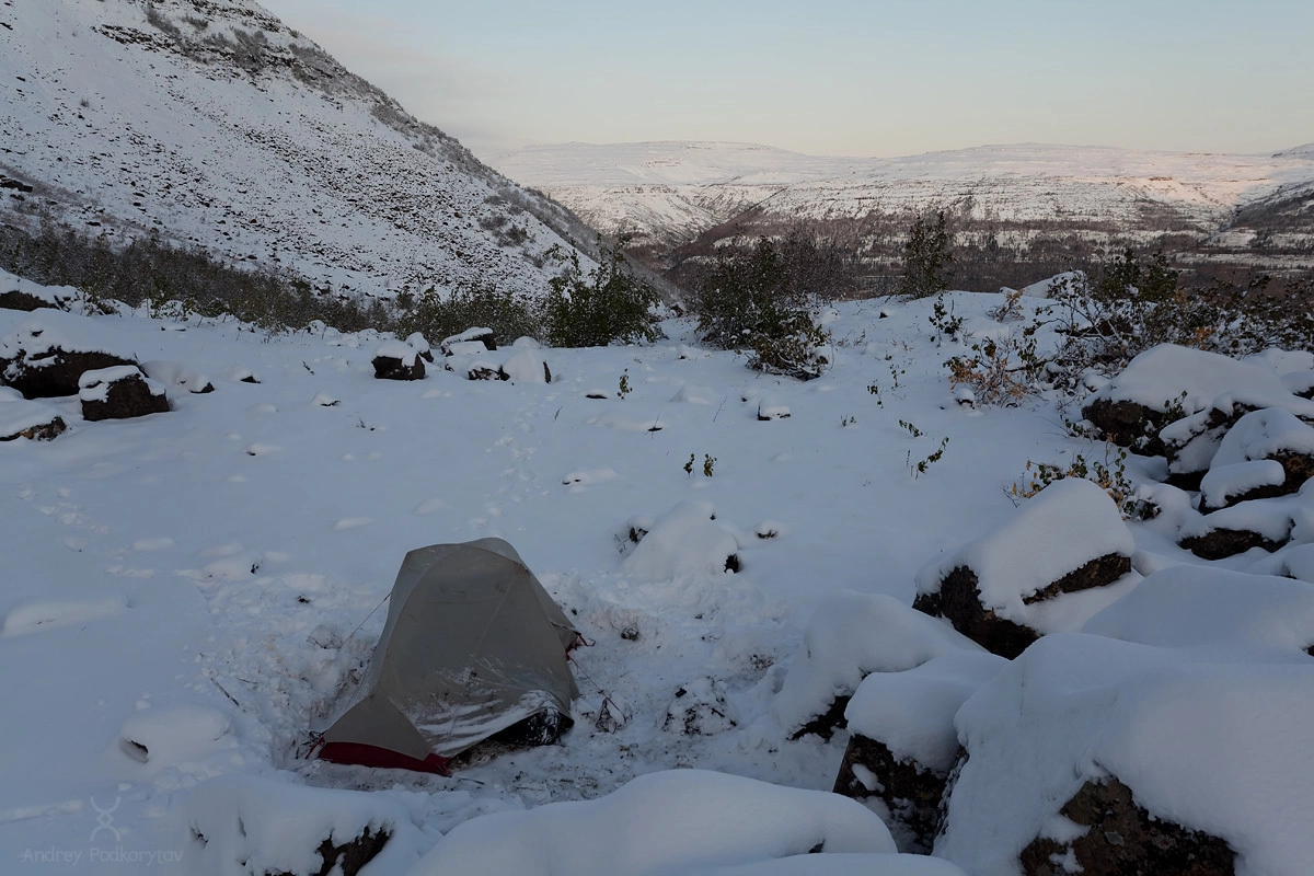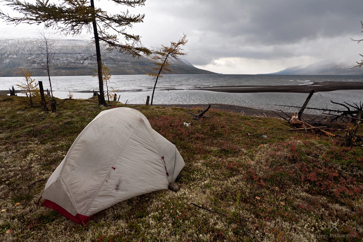 По съёмке с воздуха планы реализовались далеко не все. Батареи некстати дружно чудили. Когда можно было летать — спасал коптер в каньоне, когда был готов летать — слушал сильные порывы ветра… По-другому поздней осенью — это жить на тёплой базе, вкусно есть и ходить вокруг неё. Тоже неплохо, но не для седьмого раза. Будьте вежливы в гостях, дружите со своей техникой, сохраняйте в смартфон кэш видео, имейте спутниковый навигатор и не летайте летайте аккуратно в каньонах плато Путорана. Осень на маршруте получилась поздней. Окружение слегка смурное и задумчивое (не слегка). Если не придираться, в целом, вышло хорошо: комаров нет, снег есть, ночью наверху до -8 тепла, а внизу почти постоянно дождь и ветер. Вокруг всё серенькое, блёклое и туманное. Свой колорит найти можно. Если постараться.