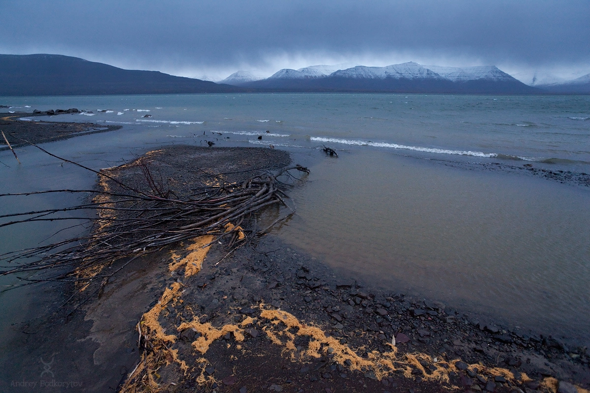 Про сухой гидрокостюм немного думал, но не так сильно, чтобы прямо взять его с собой. Сменный комплект термобелья после мокрого сплава был гарантом благополучия. Шлось берегом озера Собачьего хорошо, потому что шлось бодро (всё сушилось на себе после бурной Накты). Продрожал обед и пошёл дальше берегом. Переодеваться в сухое хочется, но не на ветру.