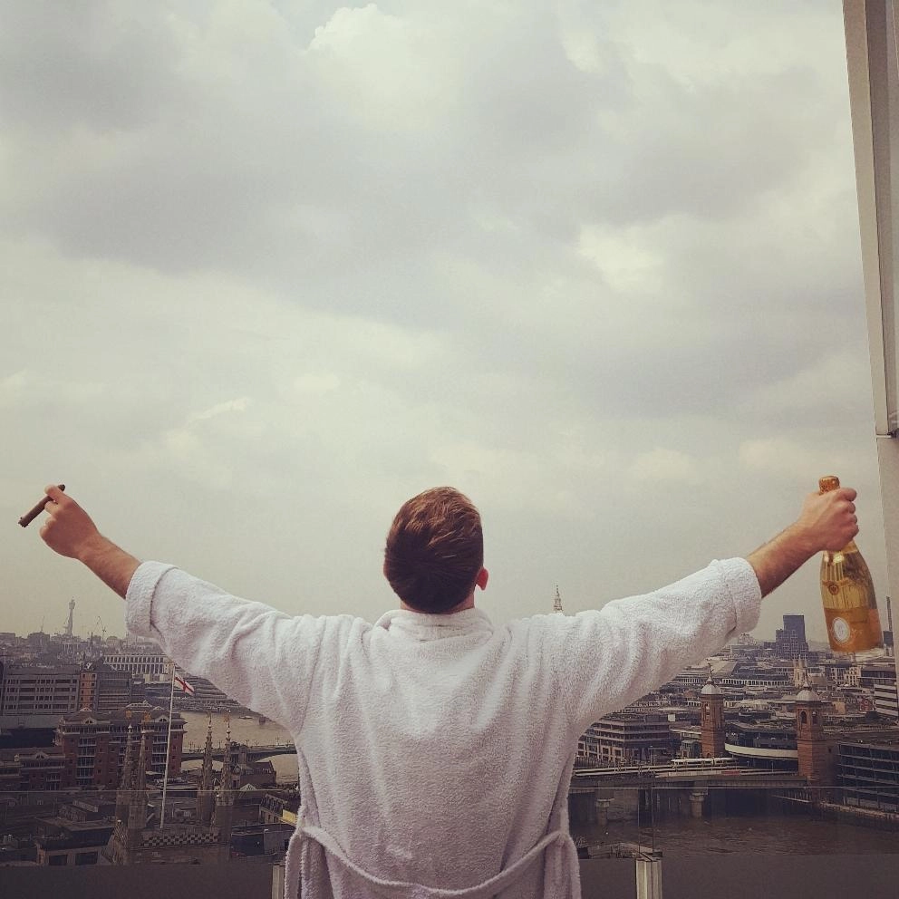Красивое времяпровождение — тоже легко может оказаться иллюзией. На одном из своих фото молодой человек сфотографировался на балконе в душевом халате. В его руках сигара и бутылка дорогого алкоголя. Перед ним — самое сердце Лондона.