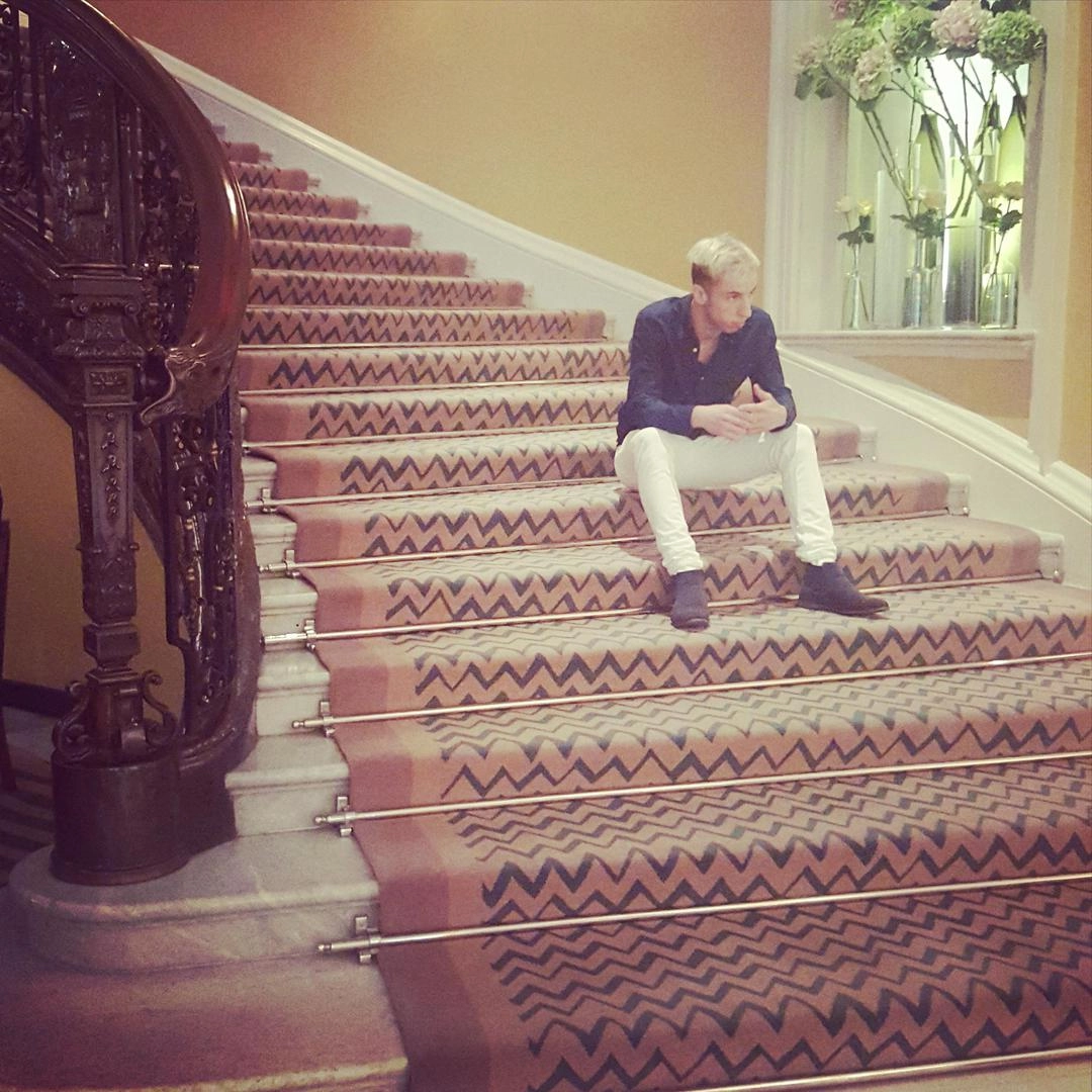 Даже фотография в лобби дорогого отеля не является проблемой для находчивого молодого человека. Он просто уверенно проходит в здание и садится на ступенях.