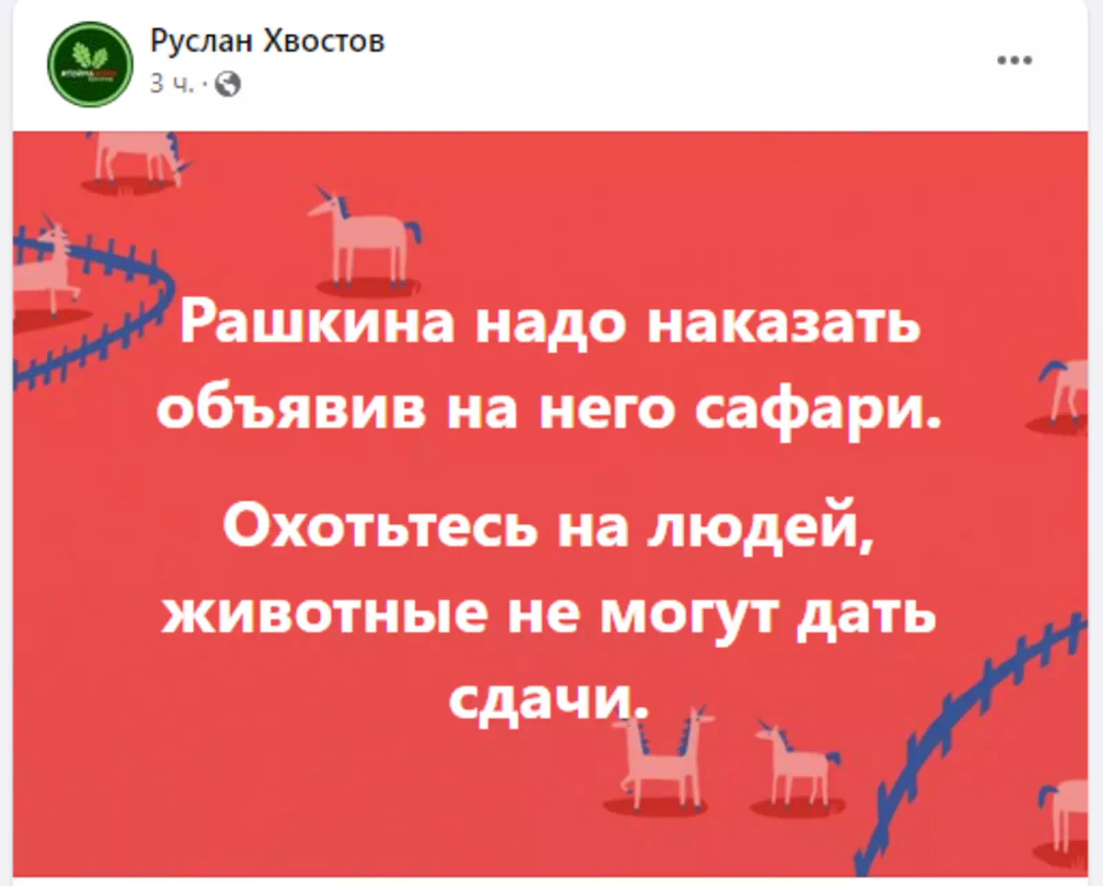 «Охотьтесь на людей, животные не могут дать сдачи», — призвал зоозащитник.