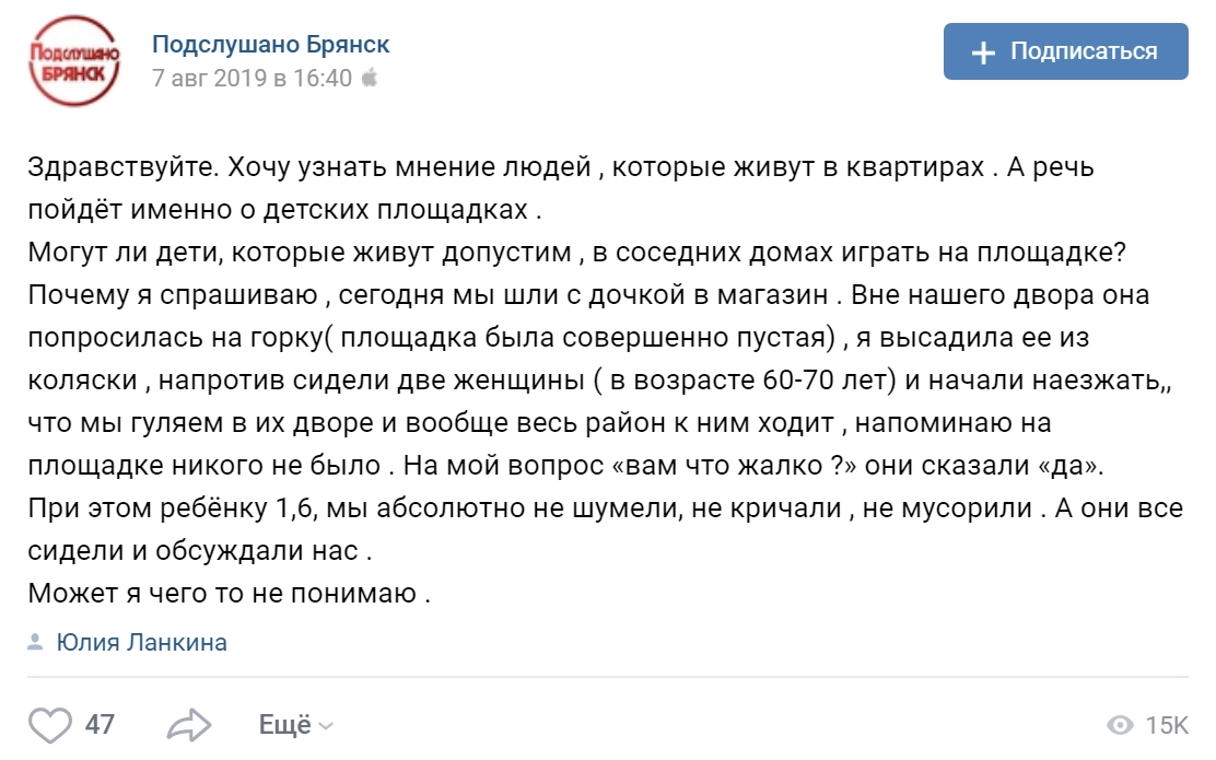 В Сети ранее обсуждалась похожая история, произошедшая в Брянске. Там мать зашла с полуторагодовалой дочерью на детскую площадку в чужом дворе, где им сделали замечание пенсионерки.
