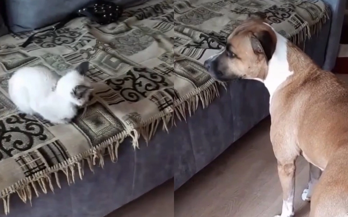 Пользовательница TikTok под ником ladys_hanna_elena поделилась забавным роликом со своей собакой по кличке Ханна, которую напугал новый питомец. Хозяйка на время принесла домой котенка, которому собирается найти семью, и он заставил Ханну волноваться. От беспокойства хвостатая, кажется, забыла, как шевелиться и дышать, в то время как котенок чувствовал себя просто отлично. Конечно, владелица Ханны сказала ей, что котофей безобиден, но бедолага в это не поверила.